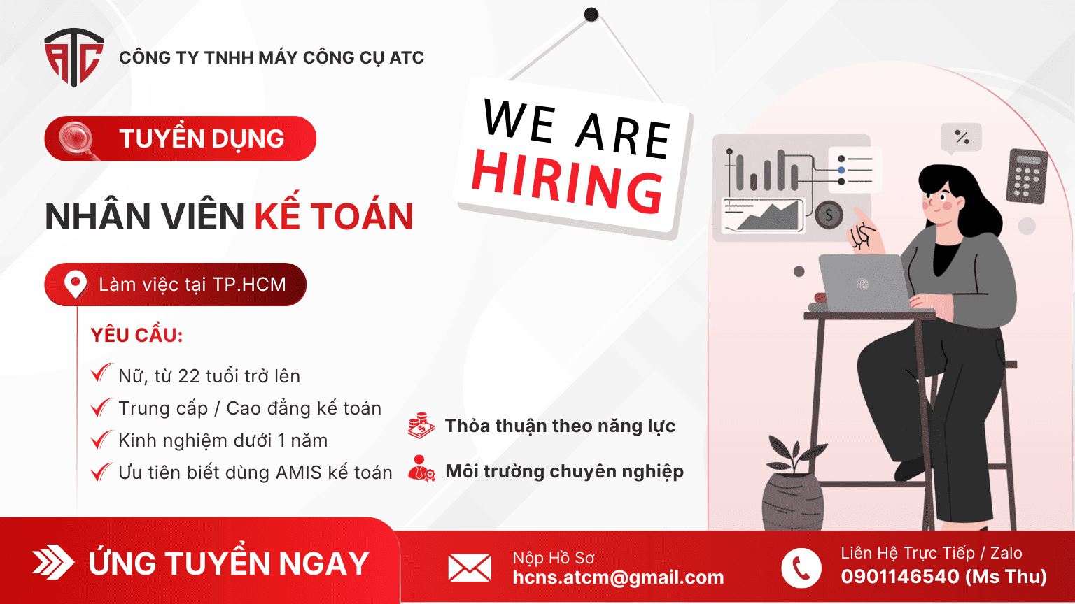 Nhằm bổ sung nhân sự và phát triển đội ngũ, ATC tuyển dụng Nhân viên kế toán để hỗ trợ quản lý nghiệp vụ bán hàng, mua hàng và theo dõi kho máy móc – vật tư trong quá trình vận hành kinh doanh.